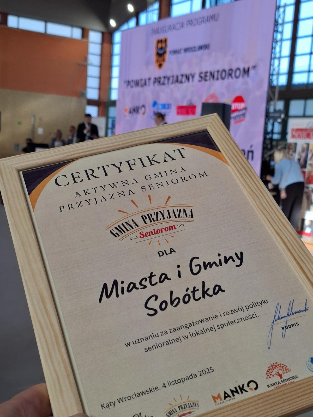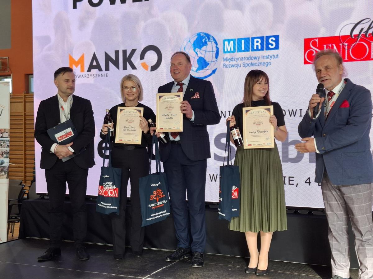 Podczas spotkania Mirosław Jarosz - Burmistrz Miasta i Gminy Sobótka odebrał z rąk prezesa Stowarzyszenie MANKO certyfikat „Gmina przyjazna seniorom”, potwierdzający zaangażowanie samorządu w działania na rzecz osób starszych
