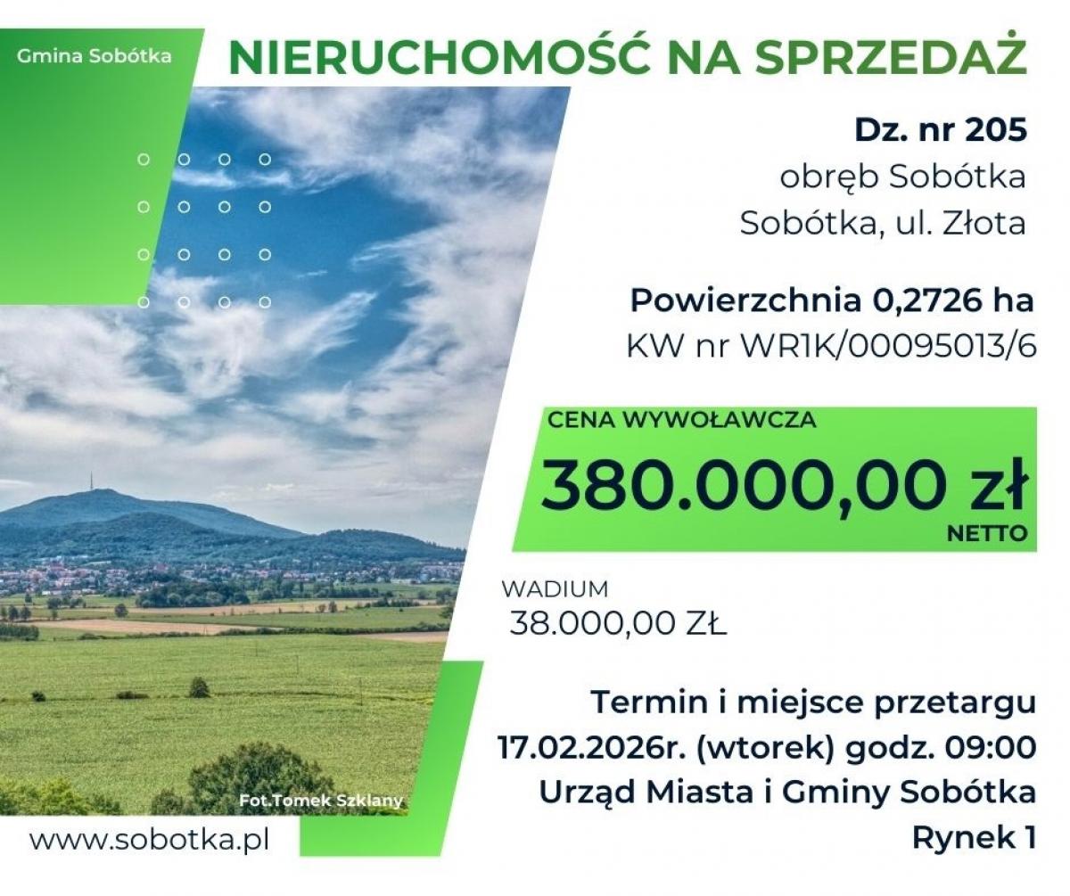 Dz. nr 205, obręb Sobótka, o pow. 0,2726 ha, położona w mieście Sobótka, przy ul. Złotej. KW nr WR1K/00095013/6. Przeznaczenie w mpzp: D-MN/U3 – teren zabudowy mieszkaniowej niskiej intensywności z zabudową usługową.