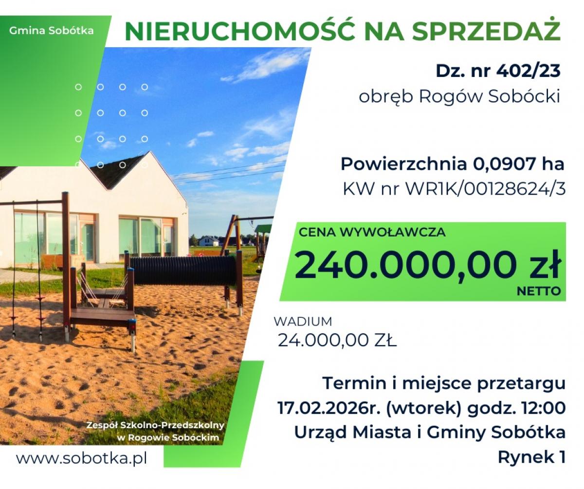 Dz. nr 402/23, obręb Rogów Sobócki, o pow. 0,0907 ha, położona w Rogowie Sobóckim. KW nr WR1K/00128624/3. Przeznaczenie w mpzp: MN34 teren zabudowy mieszkaniowej niskiej intensywności.