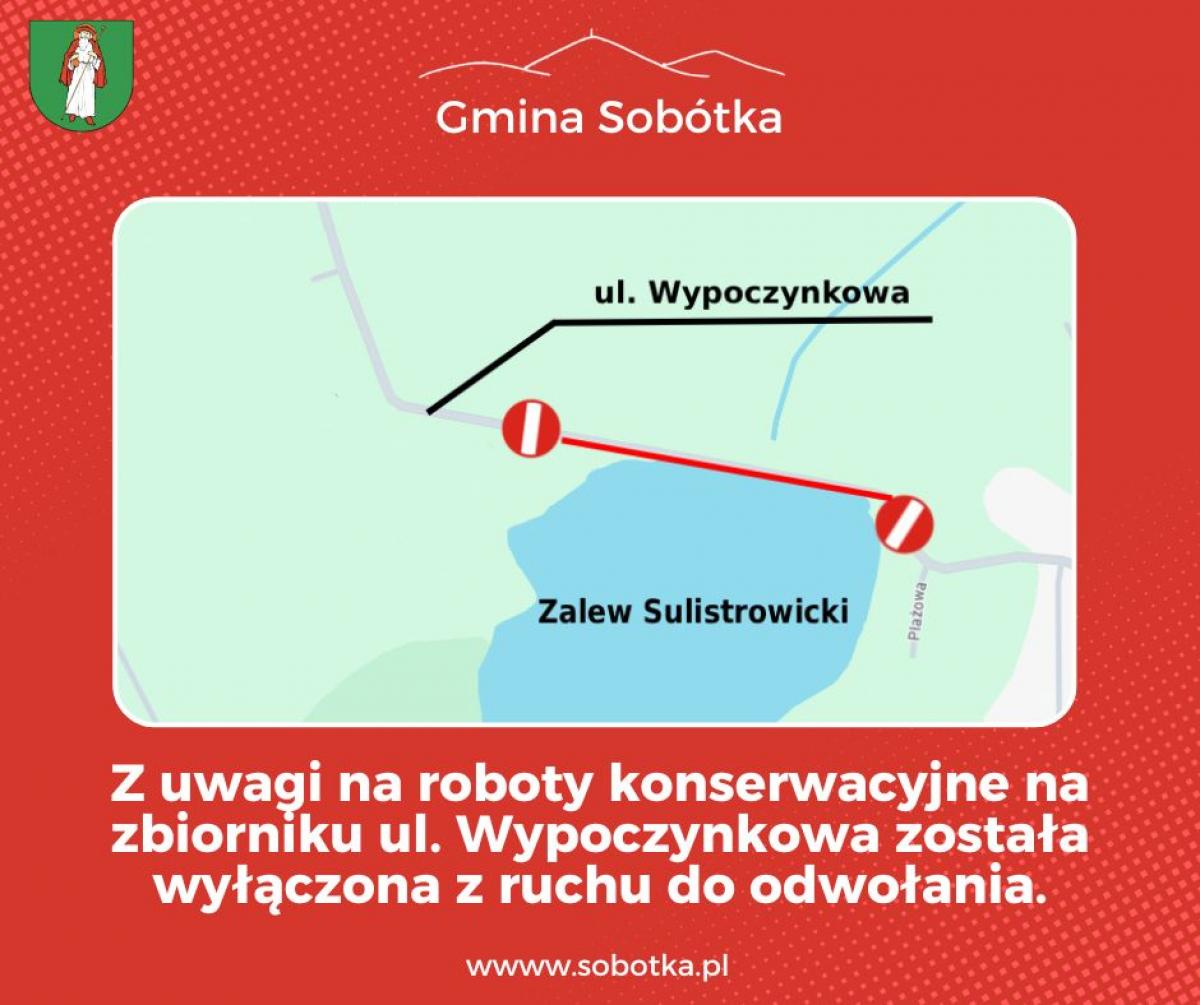 Z uwagi na trwające prace konserwacyjne na Zalewie Sulistrowickim w rejonie urządzeń spustowych została wyłączona z ruchu pojazdów ul. Wypoczynkowa do odwołania