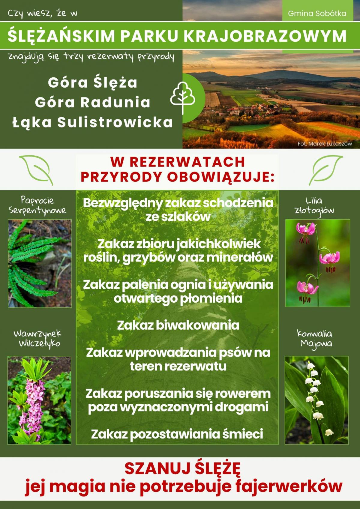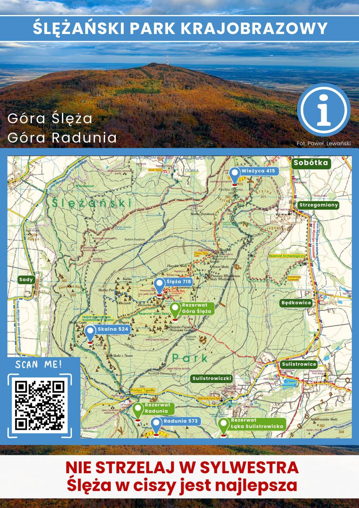 Mapy, oznaczenia szlaków, informacje o granicach rezerwatów oraz materiały edukacyjne są informacją o ochronie wrażliwej przyrody. Każdy, kto wchodzi na teren Ślężańskiego Parku Krajobrazowego, bierze na siebie odpowiedzialność za to, co po sobie zostawia: ślady, hałas, śmieci albo… dobry przykład.